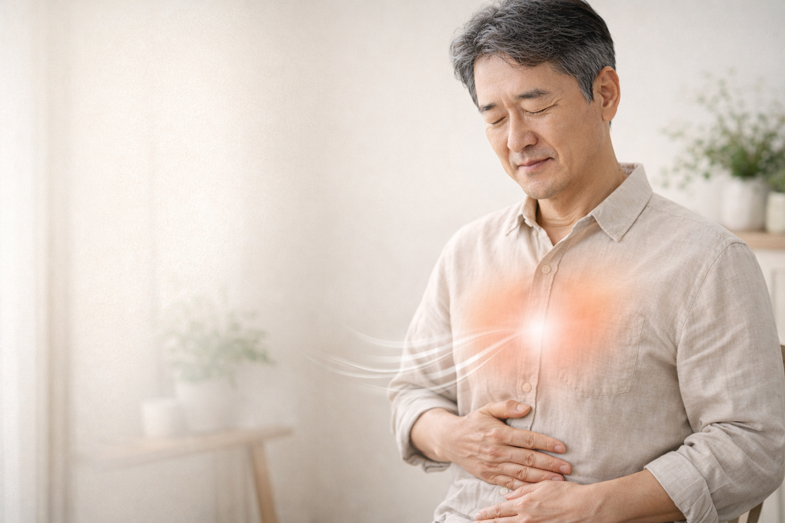 위산이 식도로 역류하면 가슴 중앙이 답답하거나 타는 듯한 느낌이 들 수 있습니다. 식후에 증상이 심해지고, 누우면 더 불편해지는 것이 특징입니다.