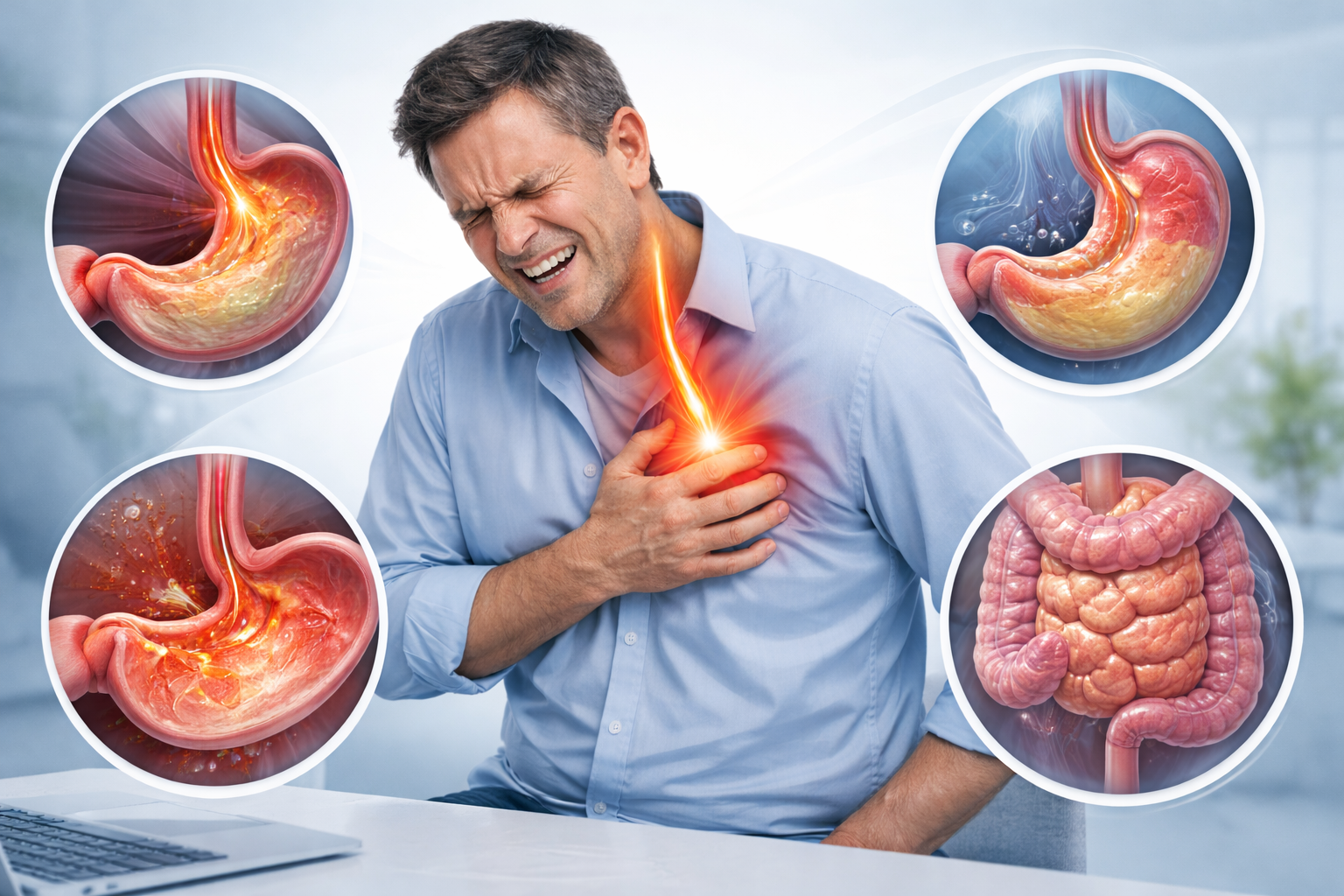 위산이 식도로 역류하면서 가슴 중앙에 통증을 유발할 수 있습니다. 많은 분들이 심장 통증으로 오해하는 대표적인 원인입니다.