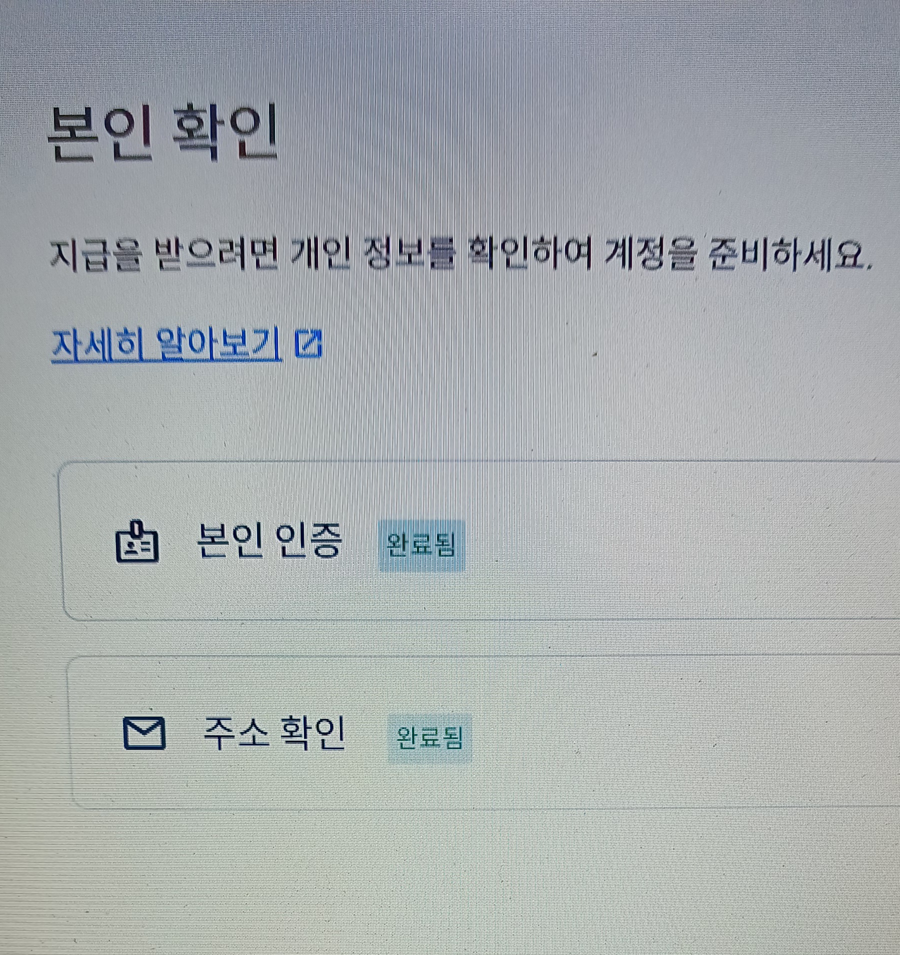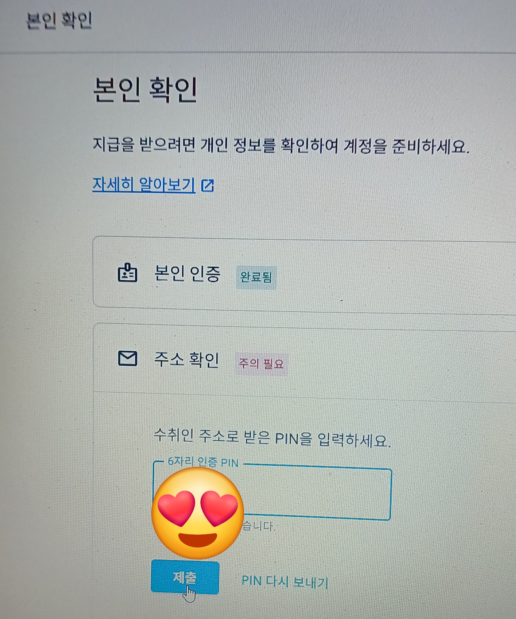 구글에서 온 이메일로 들어가시거나, 구글 애드센스로 들어가셔서 입력해 주시면 됩니다. PIN 번호 입력은 본인인증 절차 중 한 부분입니다. 구글 애드센스 수익을 지급하기 위해서 해당 주소로 PIN 번호를 보내서 받은 사람이 PIN번호를 입력하게 되면, 수신인의 정확한 주소도 확인되고, 수익을 지급받으실 분의 신분확인이 되니까요. 금전과 관련된 문제이기 때문에 제일 중요하죠. 주소확인의 분홍색 부분이 '주의필요'에서 PIN번호 6자리를 입력하고 나니, '완료됨'으로 표시가 되었습니다.