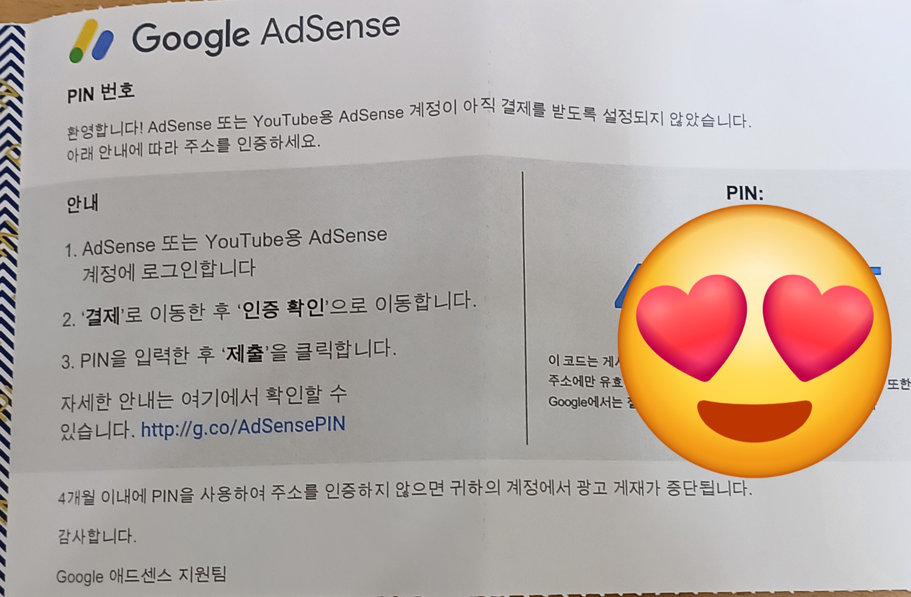 점선을 따라 겉 봉투를 뜯으면 속에는 이런 내용이 나옵니다. PIN번호를 입력하는 순서 안내내용을 설명해 주셨고, 이모티콘으로 처리한 부분에 PIN 번호 6자리 숫자가 적혀 있습니다. 이 핀(PIN) 번호를 구글 애드센스에 들어가서 입력해 주시면 핀(PIN) 번호 입력 작업은 끝입니다.