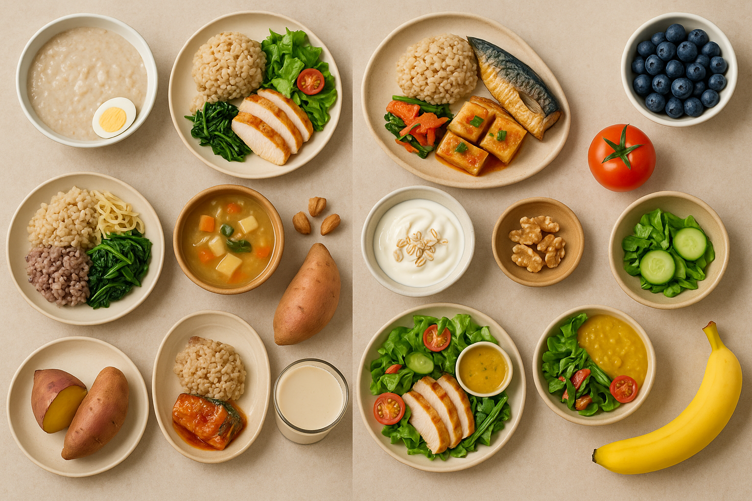 - 단백질 강화 – 살코기, 생선, 두부, 콩류로 근육과 대사 촉진