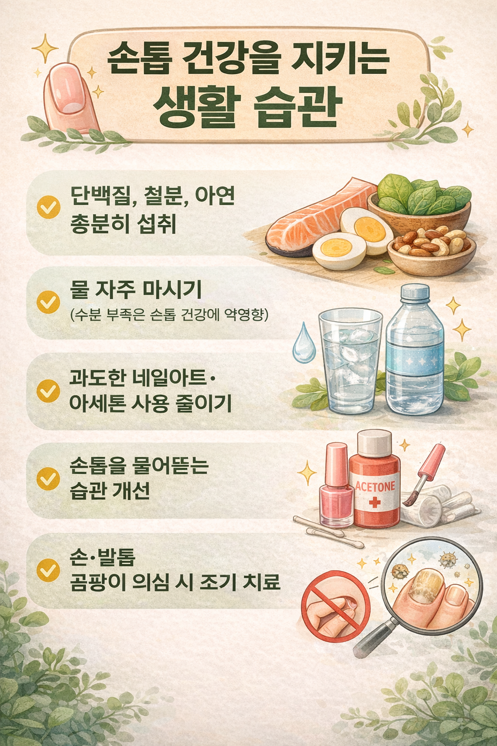 - 물 자주 마시기 (수분 부족은 손톱 건강에 악영향)