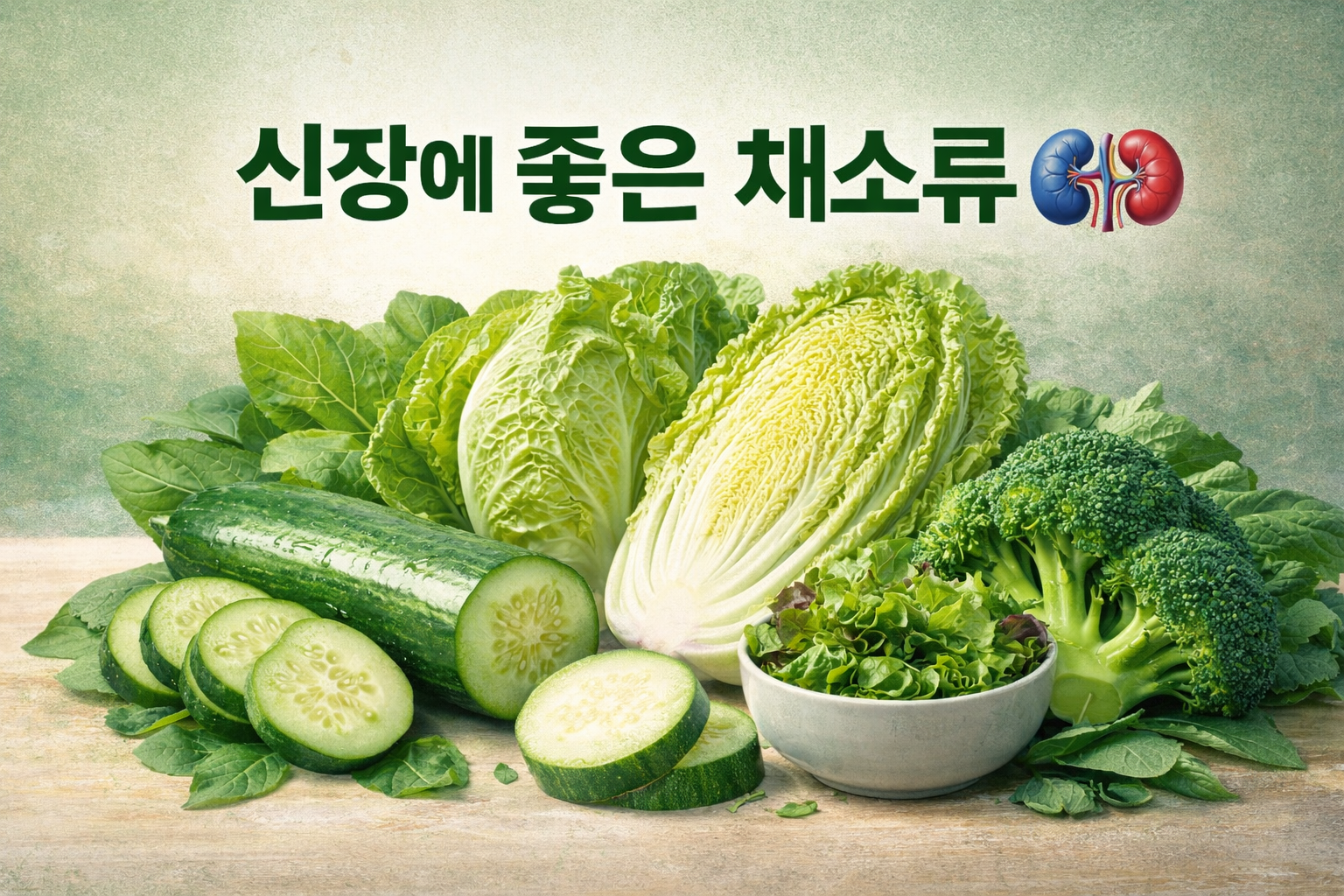 오이, 애호박, 양배추, 상추, 배추 등이 있고, 신장의 노폐물 배출을 돕고 수분 균형 유지에 도움을 줍니다.