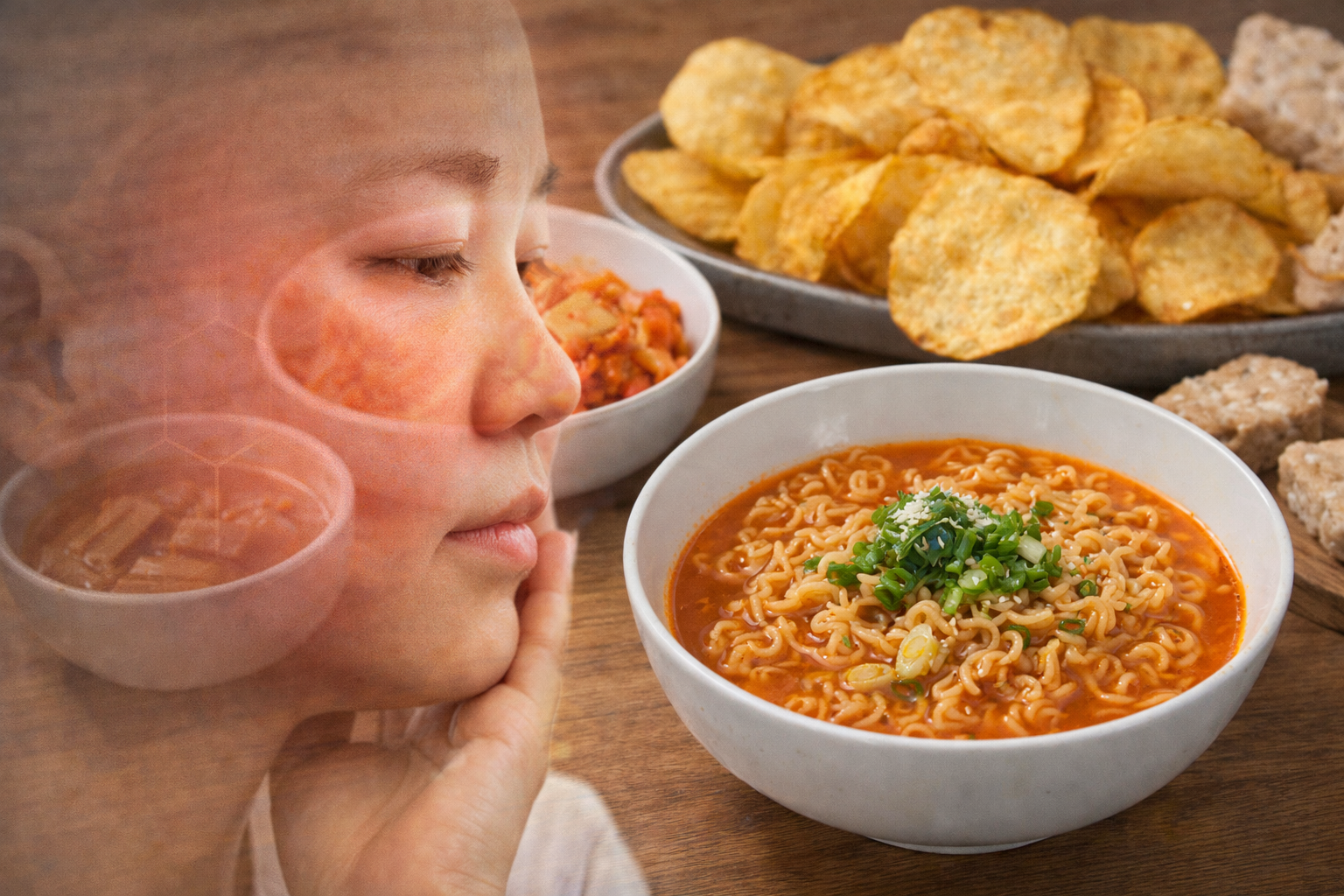 아침에 얼굴이 부어서 우울한 모습과 얼굴을 붓게 만드는 식습(AI생성)