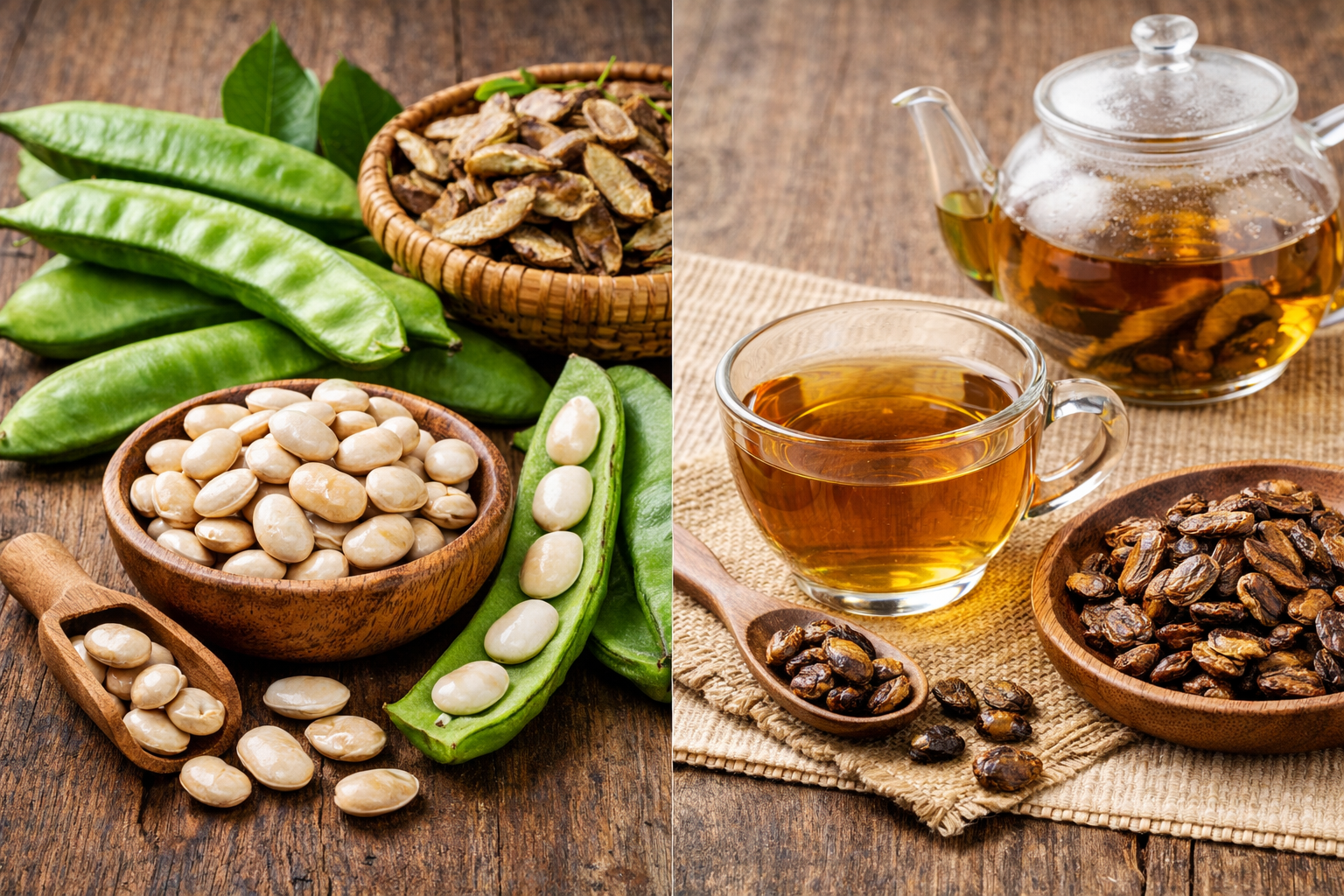 작두콩은 일반 콩보다 크고 납작한 모양이 작두(대형 칼)와 닮아 붙여진 이름입니다. 예로부터 한방에서는 비염, 가래, 염증 완화에 활용되었으며, 볶아 차로 우린 작두콩차 형태가 가장 대중적입니다.