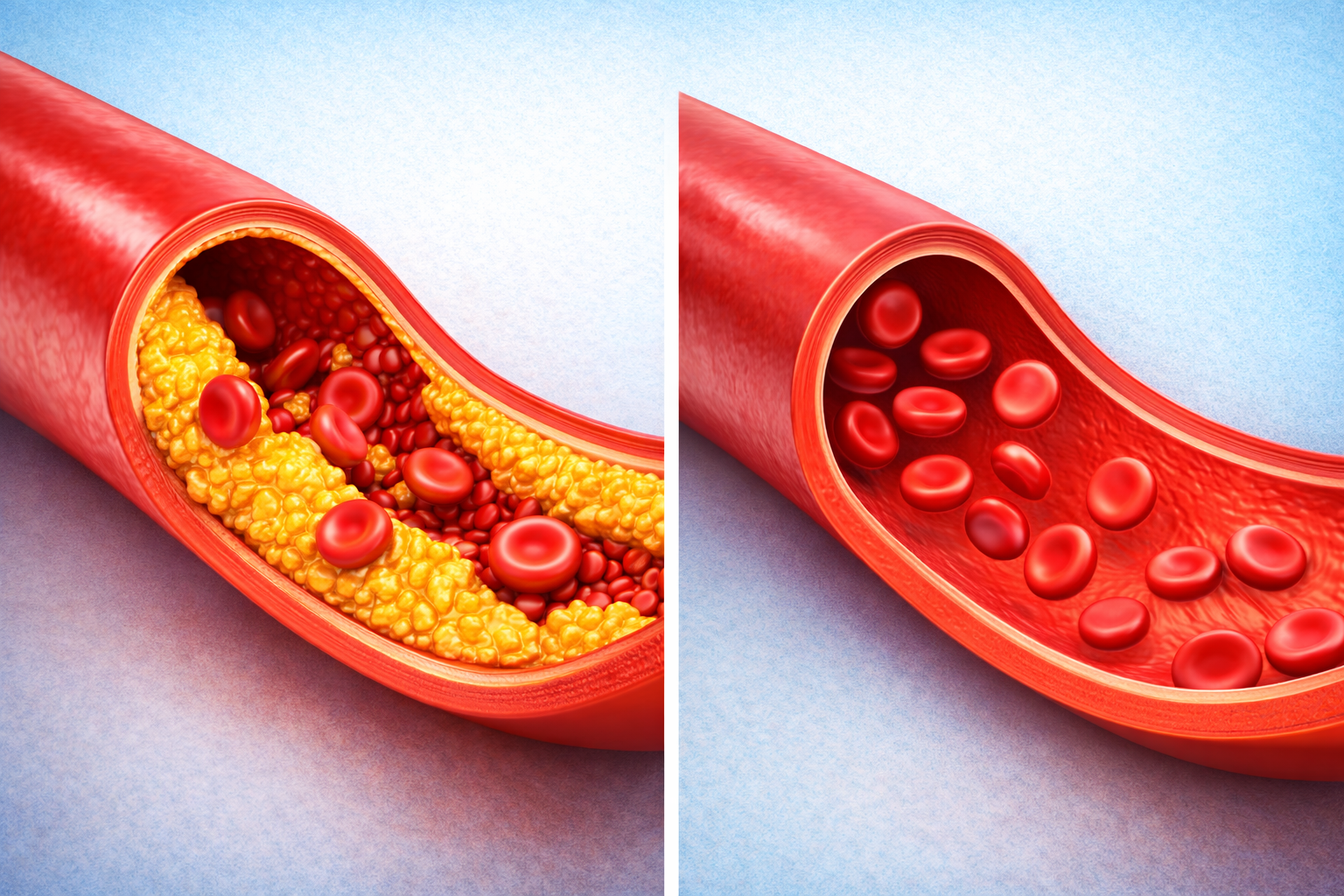 중성지방 정상수치 기준, 중성지방이 가득한 혈관내부와 정상혈관 내부 가상표(AI생성)