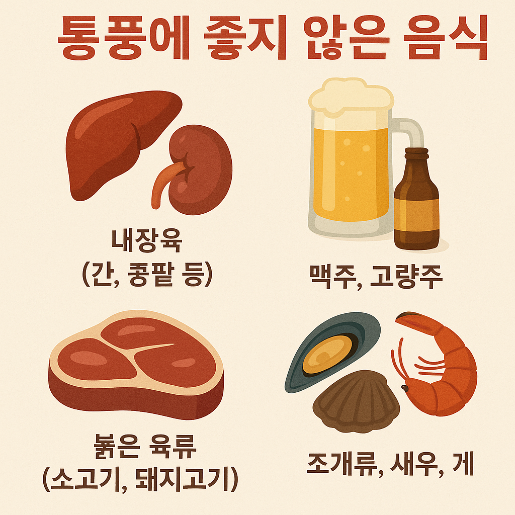 - 고기, 내장류, 해산물, 맥주 등 퓨린 함량이 높은 음식을 자주 섭취할 경우 위험이 증가합니다.