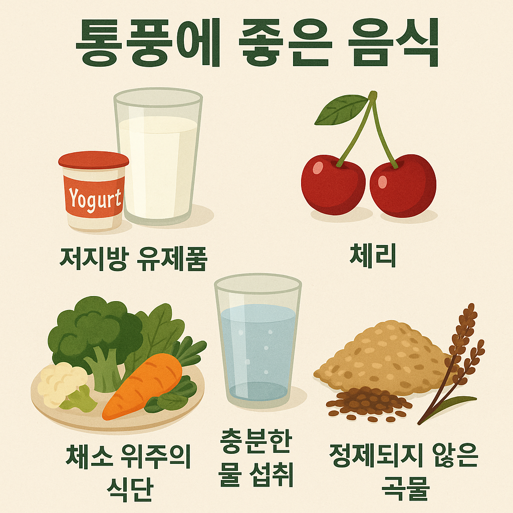 - 🥦 채소 위주의 식단: 퓨린 함량이 낮고 섬유질 풍부