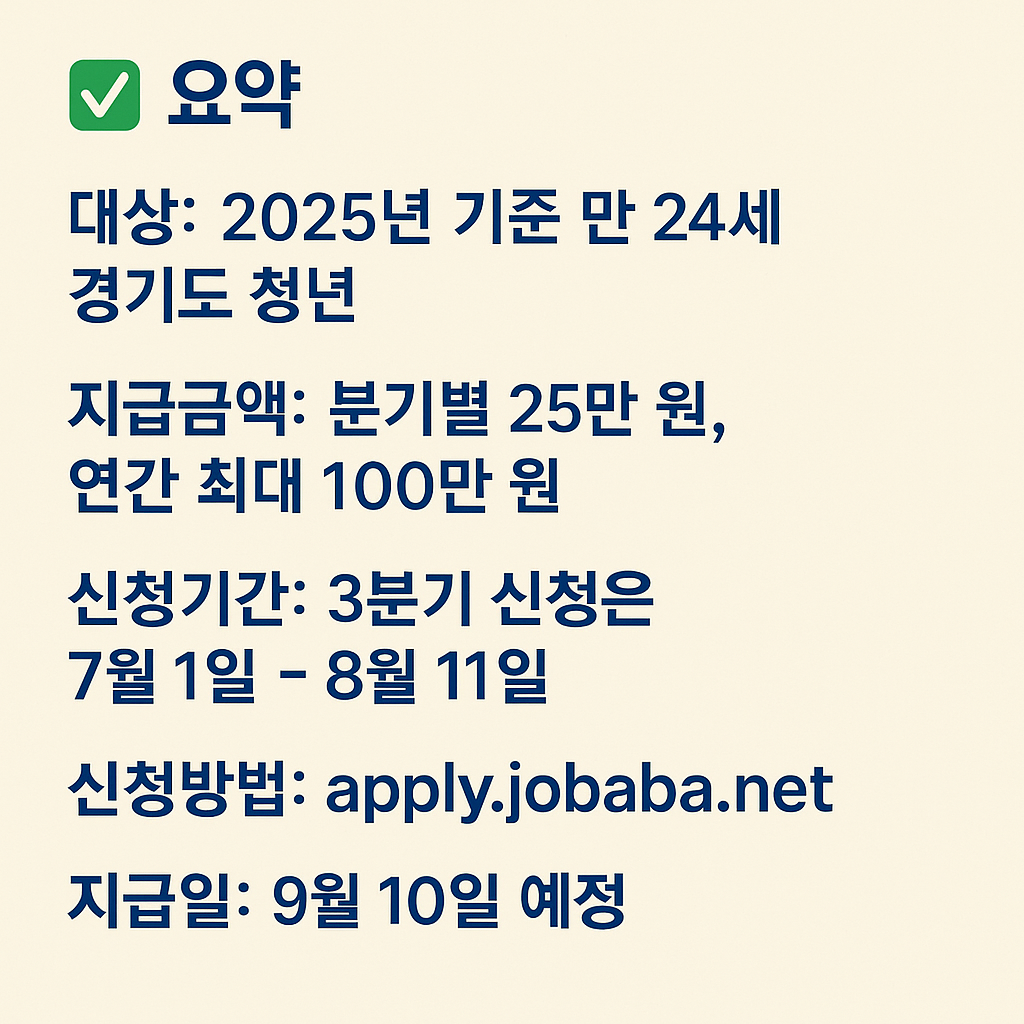 청년층의 경제적 자립을 돕기 위한 경기도 청년기본소득은 매 분기 25만 원, 연간 최대 100만 원의 지역화폐를 지급하는 제도입니다. 만 24세 경기도 청년이라면 누구나 대상이 될 수 있어, 많은 관심을 받고 있습니다. 특히 2025년 3분기 신청기간(7월 1일 ~ 8월 11일)이 현재 진행 중이므로, 자격을 충족하는 분들은 서둘러 신청하시기 바랍니다.