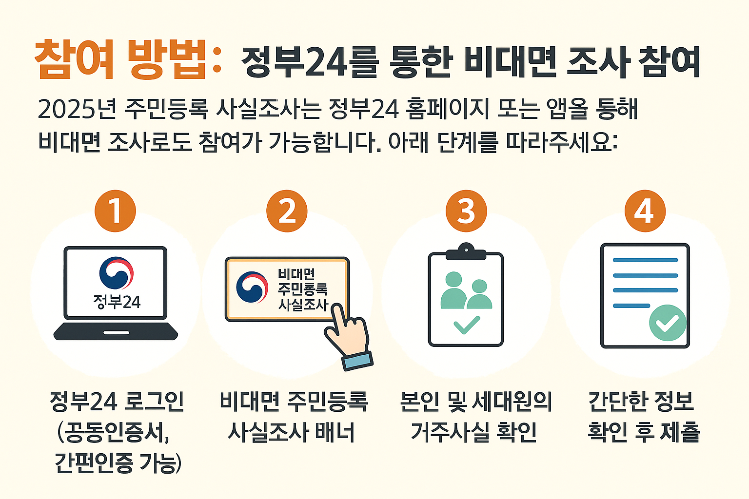 2025년 주민등록 사실조사는 정부 24 홈페이지 또는 앱을 통해 비대면 조사로도 참여가 가능합니다. 아래 단계를 따라주세요: